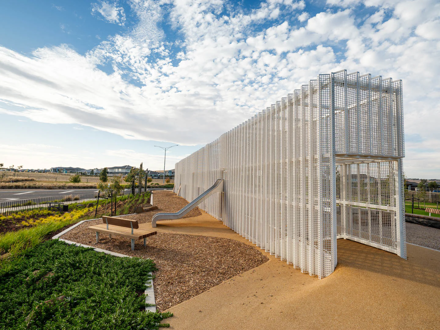 The new Hillview Drive Park features a 30 metre-long playable sculpture set on top of a lush, planted mound.